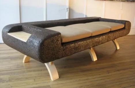 Les morceaux de liège sont parfois collés sur un support, comme un panneau patchwork, qui est parfois utilisé dans l'œuvre elle-même, et parfois disposés en fines lignes ; tout dépend du projet. À droite sur la photo : un canapé en liège de Trevor O'Neil. https://www.trevoroneil.com/